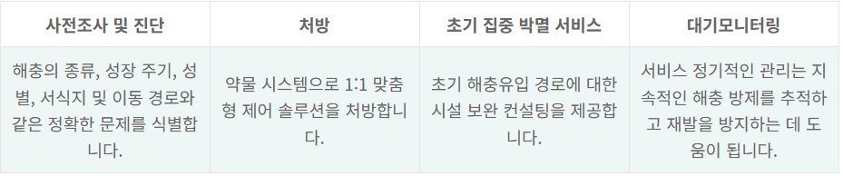 전문 컨설턴트가 세스코패밀리서비스를 활용해 문제해충의 정확한 종류와 성장주기, 성별, 서식지, 침입, 이동경로 등을 파악해 세스코연구소가 개발·생산한 의약품 시스템을 적용해 맞춤형 방제 설루션으로 처방하고 있습니다. 처방받은 약물 및 통제 설루션을 적용하면 한 번의 서비스만으로 90% 이상을 없앨 수 있습니다.